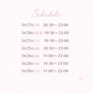 出勤予定です⏳ こんにちは、とあです! 今月後半の出勤予定をまとめました! 最近少しずつ慣れてきましたが、 まだドキドキすることも多いです…☺️ 明日は朝から1日いるので、タイミング合う方いたらゆっくり過ごせたら嬉しいです🌙